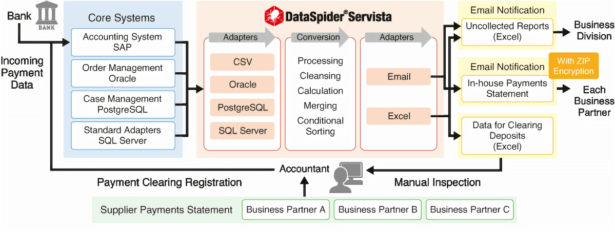 To automate their incoming payment clearance process*, the company integrated multiple in-house systems. This was achieved using DataSpider Servista (herein, “DataSpider”), a data integration platform with a large variety of adapters for smoothly connecting different systems.