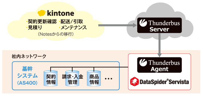 DataSpider ServistaのHTTPトリガーと、クラウド上にあるkintone、Thunderbusを組み合わせることにより、オンプレミス側にある基本契約情報、請求・入金管理と、クラウド上にある見積りや配送/引取情報、メンテナンス情報とのデータ連携が、専用線や特別なハードウェアの必要もなく実現できた。