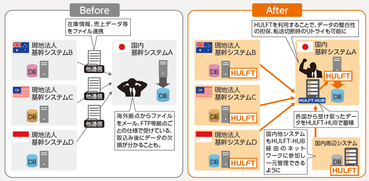 海外システムとのファイル交換を「HULFT」で効率化<br>国内も含めた連携ハブとして「HULFT-HUB」を活用メイン画像