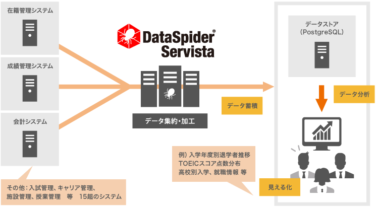 学校法人 京都外国語大学では、財務システムのオープン化とともに新たにワークフローシステムを導入、大学の諸活動に関して情報収集・蓄積し、分析を行うことで意思決定につなげるIR(Institutional Research)に必要なデータ抽出のための基盤をDataSpider Servistaを使って約1か月で構築。