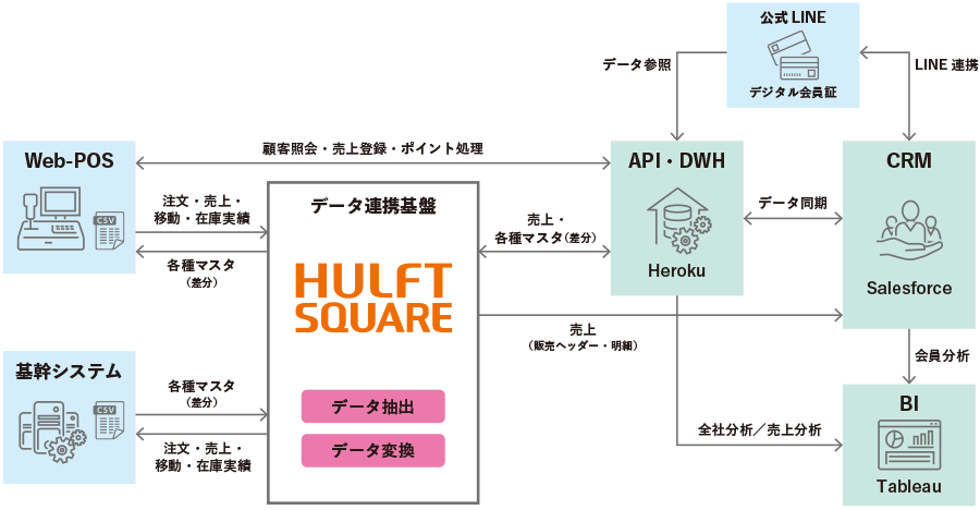 「Web-POSの売上情報やポイント情報はDWHのAPIを利用してリアルタイムに連携しつつ、最終的な売上・在庫やマスタなどの業務データはHULFT Squareにより夜間に一括連携する2段階のフローとしています(戸倉氏)」