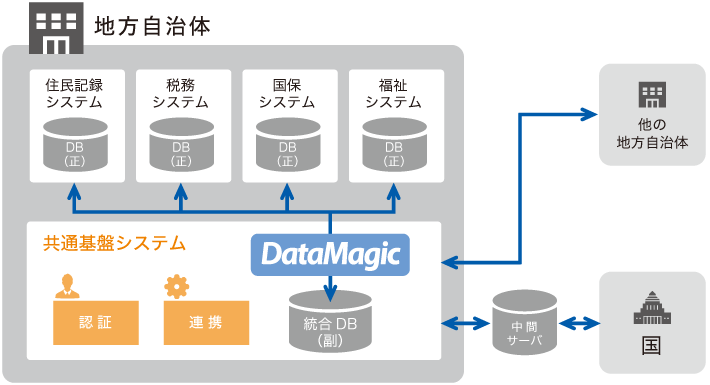 共通基盤システムの統合DBには各業務システムからデータのコピーが集約されるが、これらを国が定めるデータフォーマット(地域情報プラットフォーム準拠)に整えた上で中間サーバに送る必要があり、そこでDataMagicのデータ変換機能が用いられている。