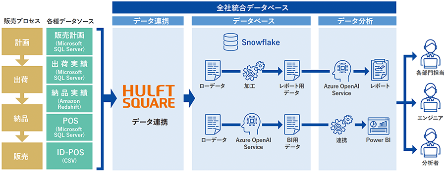 またSnowflakeに蓄積されたデータを活用し、バックグラウンドで生成AIを活用して新たなインサイトをアウトプットするなど、データ処理のなかに生成AIを組み込んで業務活用する場面でもデータ連携/分析基盤が活用されつつある。「商品に関するアンケート調査の結果といった非構造化データをSnowflakeに投入し、生成AIにて解析したうえで定量的な分析結果としてマーケティング部門に提供するといった検証も進めています。近い将来、プロダクトとして本格的に現場に提供する計画です」と山縣氏は説明する。生成AIに関しては、システムに詳しくないメンバーでも自然言語でデータ探索でき、分析後のアクション考察といったクリエイティブな業務に広げていくことが検討されており、生成AI活用に必要なデータ収集の一部でHULFT Squareが活用されることになる。