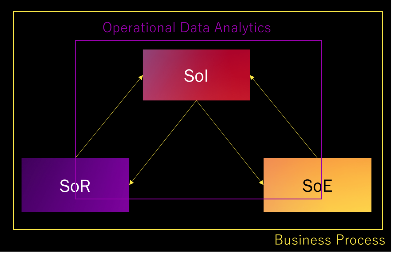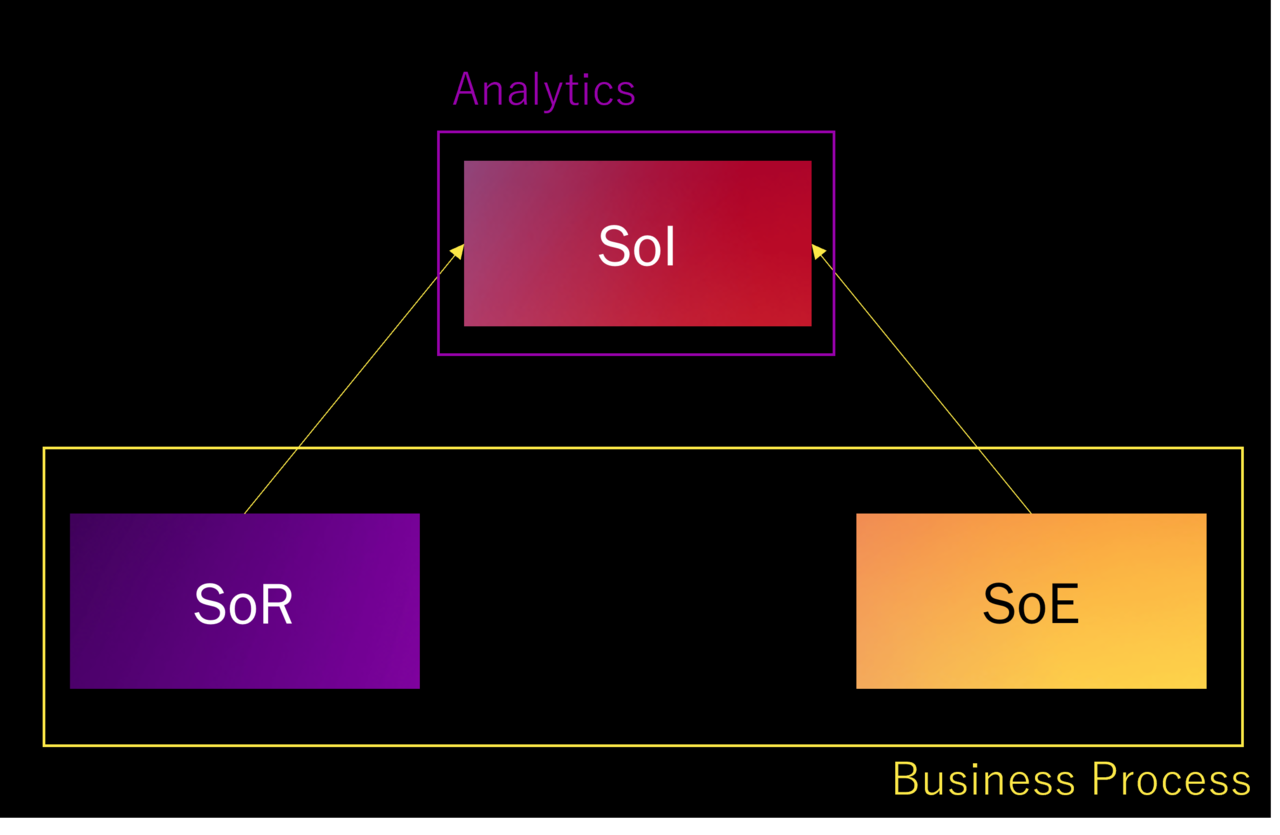 つまり、システム領域で見るとSoI=Analyticsです。そしてAnalyticsは業務プロセスに対して外付けの概念になります。