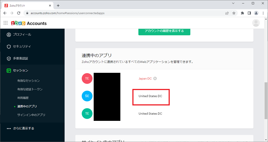 作成したアプリケーションの地区名を確認します。名前部分をクリックして「My Account」を押してください。Account画面が表示されましたら、左側の「セッション」→「連携中のアプリ」を選択して、連携したいアプリのApp's data center (Japan DC,United States DC…)の値を確認してください。後でHULFT Squareの設定で使用します。