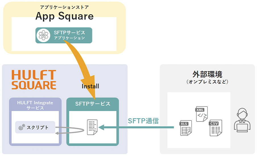 SFTPサービスは、HULFT Squareプラットフォーム上でサービスとして動作する「ネイティブ アプリケーション」として提供します。今後はHULFT Integrateのスクリプト テンプレートに加え、さまざまなサービスを順次リリースします。