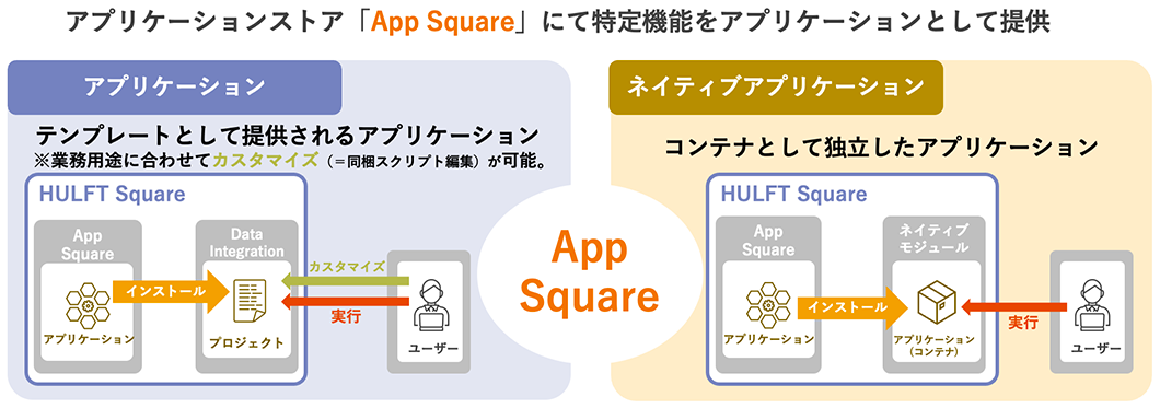 HULFT Squareでは、ワークフローやスクリプトをパッケージ化しひとつのアプリケーションとして扱い、可搬性を高めてテンプレートとして利用できるようにしています。HULFT Square内の「App Square」にて提供され、お客さまの社内で共有することができます。今後は、HULFT Squareのアップデートのタイミングに関わらずさまざまな機能を追加したり、お客さま同士で独自のものを共有したりするマーケットプレイスのような機能の実装も検討しています。