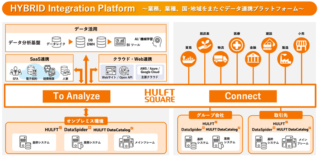 HULFT Squareは、DX実現に必要な「データ活用するためのデータ準備」や「業務システムをつなぐデータ連携」を支援する日本発iPaaS(クラウド型データ連携プラットフォーム)です。オンプレミス・クラウド・SaaSなどの環境に分散し管理されているさまざまなデータを、業務システム間、業種、国・地域をまたぎデータを連携させることができます。