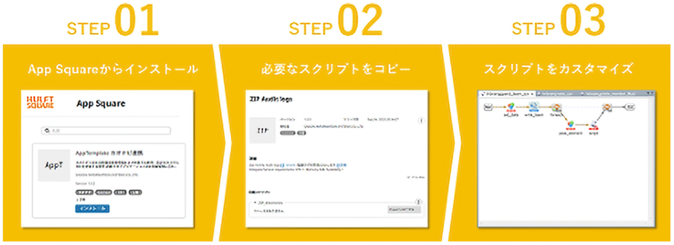 このテンプレートを利用することで、自社のニーズや環境に合わせてのカスタマイズや作成したスクリプトの部分活用など、業務改善の効果をすぐに得られます。動かしながら学ぶサンプル教材として、スクリプト開発の学習にも利用いただけます。このテンプレートは、HULFT Squareを契約中のすべての方が追加料金なしで利用可能です。