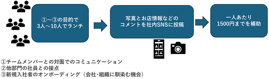 今回開始したランチ代サポートは、当社のOur Valuesのひとつでもある「互いに尊重し会話する」ことの実践として、オフィス出社の際のコミュニケーションを促進することが目的です。オフィスはフリーアドレスが基本でリモートワークとの併用もあることから、業務以外の雑談を交わす機会やネットワークがやや広がりづらい傾向がみえてきていました。そのためランチ代サポートでは「①チームメンバーとの対面でのコミュニケーション」、「②他部門の社員との接点」、「③新規入社者のオンボーディング(会社・組織に馴染む機会)」を創出できるように、ランチ1回あたりの人数(参加者数)3人以上~10人以下を対象に、ひとり1回1,500円までを会社がサポートする運用としています。月に利用できるのは①~③の目的別に計3回で、ランチ後には社内SNSに対象者全員が写った写真とコメントを投稿してもらいます。投稿記事を通じて社内における本取組みの認知拡大とオンライン上でのコミュニケーションの増幅にもつなげています。