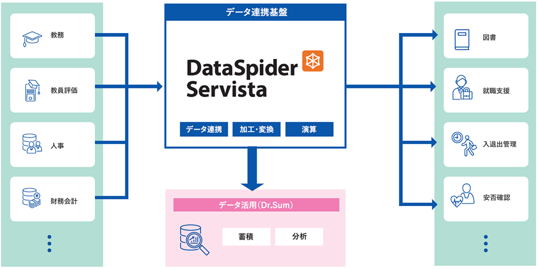 高知工科大学は、学内に分散した教学データや経営データなどを柔軟に活用できるよう、統合的なDBを整備してデータ集約を図るためのデータ連携基盤として、データ連携ツール「DataSpider Servista」を活用しています。