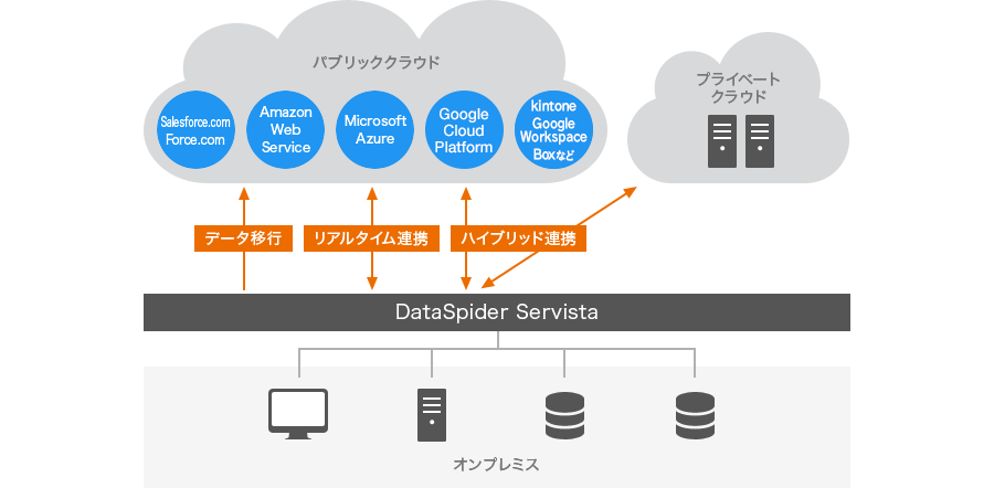 データやアプリケーションをクラウドへ移行するためには、クラウド連携が不可欠。DataSpider Servistaをオンプレミスに配置してパブリッククラウドサービスと連携させる場合なら、データ連携同様にGUIだけで簡単に実行できます。また、複数のパブリッククラウドと連携する「ハイブリッドクラウド」用のHUBとして、さらにDataSpider Servistaをクラウドに配置して、他のクラウドと連携させることも可能です。