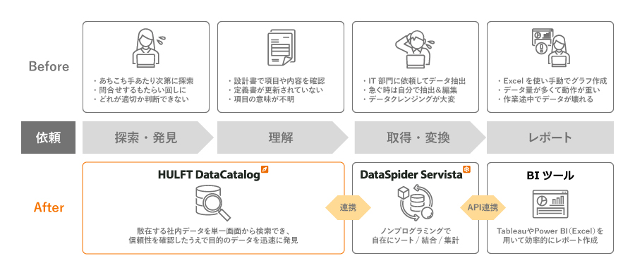 HULFT DataCatalog(ハルフト データカタログ)は、Web検索する感覚で簡単に欲しいデータを探索でき、その内容を理解したうえで確かなデータを選択するプロセスをセルフサービス化。さらにDataSpiderとの連携によって、発見したデータの活用・分析までスムーズにつなげます。