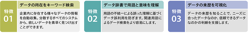 システムに点在するデータを横断的に探索することで、データ利用者は欲しいデータをすぐに発見・入手することができ、データが表すビジネス上の意味を正しく理解することで、データに裏打ちされたすぐれた意思決定をすることができます。判断に必要なデータの発見と理解を支援することで、企業のデータ活用を促進します。