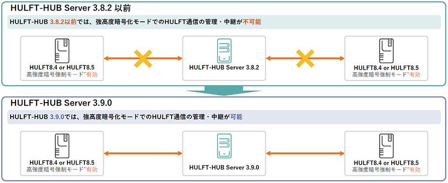 高強度暗号強制モードを有効にした状態のHULFT間でのファイル転送を、HULFT-HUBで管理および各種要求の中継が可能になりました。これにより、より強化されたセキュリティを保ちながら、HUB管理下(クライアント登録)で運用することが可能になります。