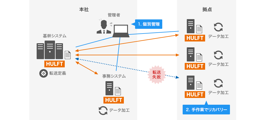 1. 障害発生時に転送データを「HULFT-HUB」上に蓄積し、復旧後に速やかに再配信!