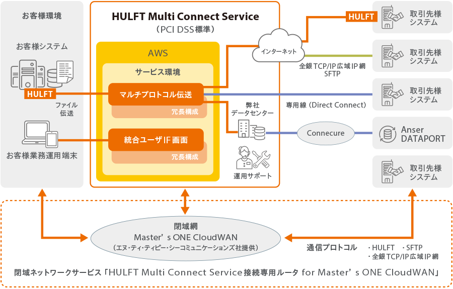 HULFT Multi Connect Serviceはインターネットでセキュアなファイル転送が実現できる、SaaS型マルチプロトコルゲートウェイサービスです。