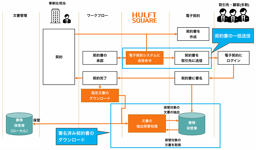 - 契約先が署名した契約書を自社内の文書管理システムに格納するために、クラウドサインからダウンロードする処理