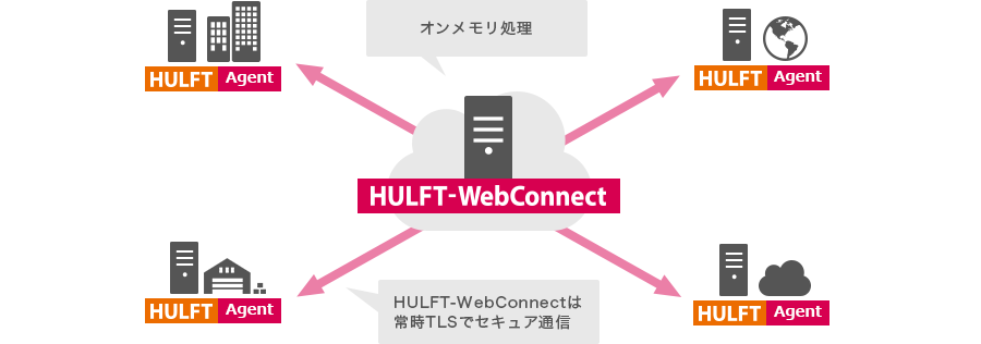 Agent/HULFT-WebConnectは中継転送中のユーザデータ(ファイル)をディスクに書き込まず、オンメモリで中継します。HULFT-WebConnectではサービスサイトの利用時やHULFTのファイル転送を中継する場合、常時TLS通信が適用されます。