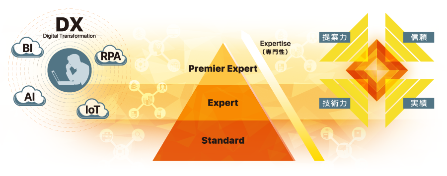 お客様がRPA, BI, AI, IoT等のIT技術でデジタルトランスフォーメーションを実現するためには技術と実績に優れ、市場の信頼が高く、お客様固有の課題に対し適格な提案を行う専門家が必要です。