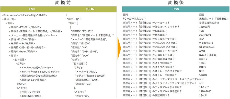 JSONはECサイトや外部サービスから取得したデータに多く使われますが、階層構造が深いため、情報の分割や検索が難しくなります。CSVに変換してフラットな構造にすることで、扱いやすいナレッジに変換できます。 - XMLファイル