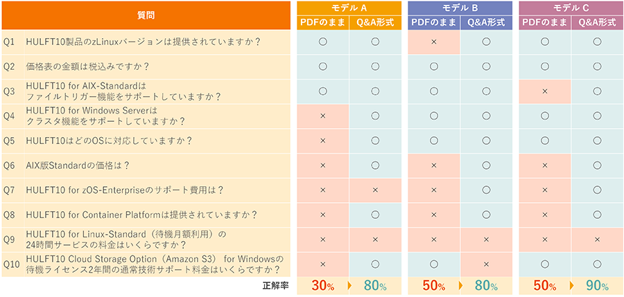 これまで説明してきた前処理の効果を、実際の検証データで裏付けます。社内実験にて、データをそのままAIに渡す場合と、前処理でQA化やフォーマット変換を行った場合の回答精度を比較しました。