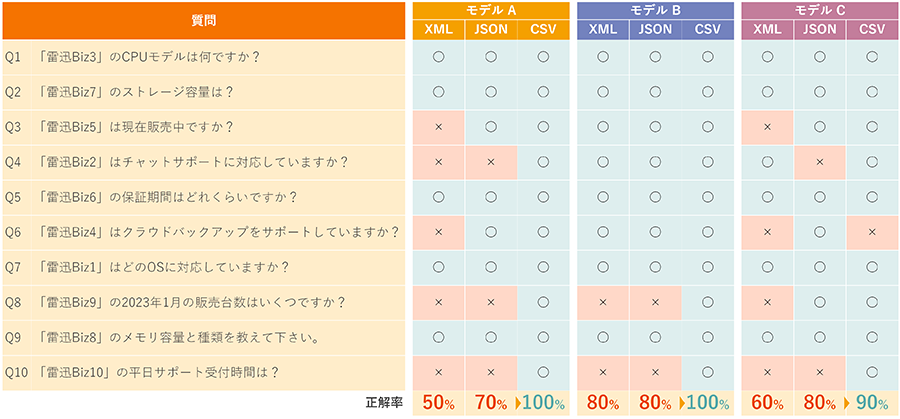 結果、CSVにQA化したデータが全体的に最も高い正答率を記録し、複雑な階層構造を持つXMLやJSONよりも単純化されたCSV形式の方がAIが理解しやすいことが分かりました。