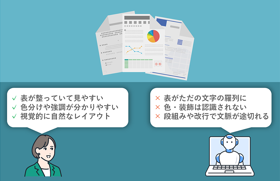 たとえば、PDFファイルには表や段組み、見出しなど、視覚的な要素が使われます。しかし生成AIが受け取るのは、それを構成する文字情報だけ。そこに表の意味や構造、段落の区切りといった文脈は存在せず、テキストの羅列として解釈されてしまいます。その結果、「関連情報が飛び飛びに読まれる」「同じ意味の語句が重複・混在する」「文書の意図が伝わらない」といった事態が起こるのです。