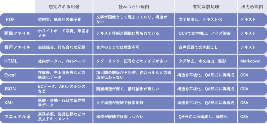 生成AIに正確な回答を出させるには、与える情報が「AIにとって読みやすい形式」になっていることが重要です。ところが現実には、業務で使われる多くのファイルがAIには読みづらい構造を持っており、それぞれに応じた前処理が必要になります。