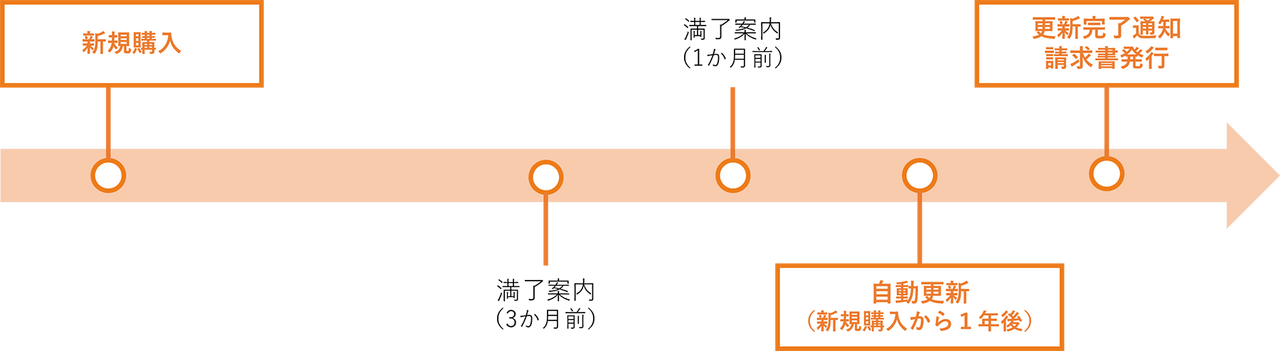 - 一つの注文で対象プロダクトを除く技術サポートが含まれる場合など、自動更新対象とならない場合があります。ご不明な点はお問い合わせください。