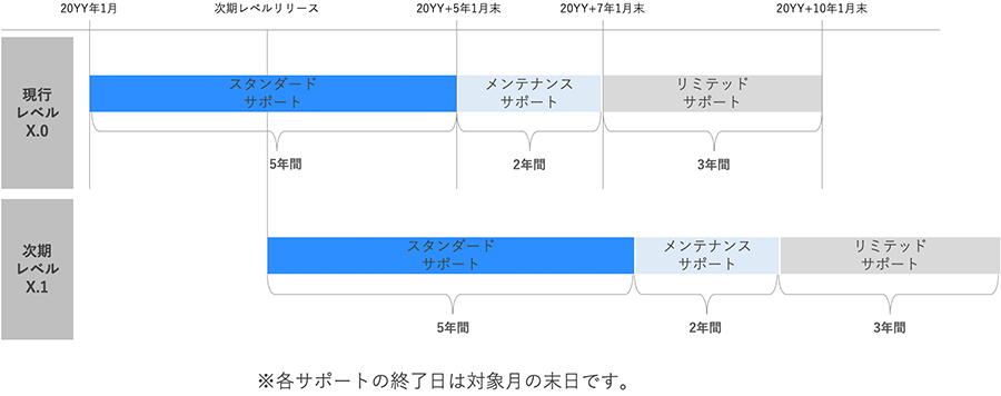サポートレベルの提供期間は製品のレベルで決まり、最新レベルのリリース時に公開します。