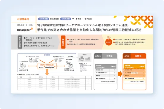 新旧システムの異なるOSやIT環境でもシームレスに接続し、連携を自動化します。定型業務が自動化されることにより、データ入力・ファイル移動や確認作業を削減します。