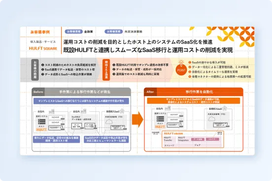 HULFTは複数の製品群で構成されており、用途に応じた役割があります。ファイル転送に特化した「HULFT」、あらゆるシステム間のデータをつなぐ国産iPaaS「HULFT Square」など、それぞれのシステム環境や業務要件に応じて選定いただけます。