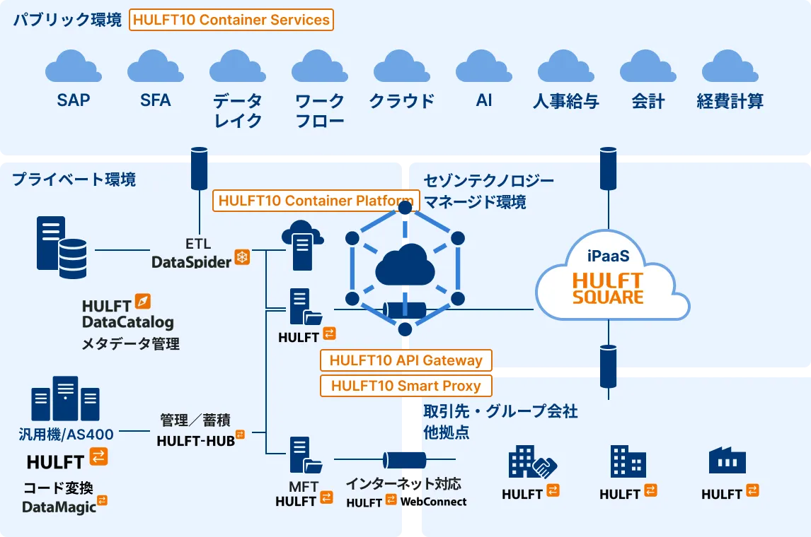 HULFT SquareやDataSpiderなどの製品は、主要なクラウド(AWS、Azure、Google Cloud等)やSaaS(Salesforce、kintoneなど)との連携テンプレートやコネクタを多数備えています。オンプレミス・クラウドのハイブリッド環境にも柔軟に対応可能です。